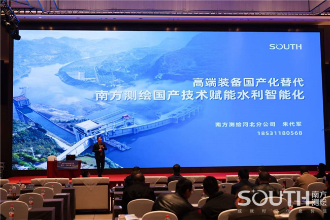 会上,南方测绘集团石家庄分公司总工程师朱代军作专题报告--《南方测绘国产技术赋能水利智能化》,他介绍了南方测绘集团凭借“天空地水工”一体化监测感知体系,在水利智能化领域实现了重大突破。公司依托全链自主研发的高端测绘装备,包括北斗位移监测系统、无人机航测平台和智能无人船等创新产品,成功打造了数字孪生水库管理平台,为卧虎山水库、小清河防洪等国家重点工程提供技术支撑。目前,南方测绘集团已建有覆盖全国30个省级分支的服务网络,形成从数据采集到智能分析的完整解决方案,正加速推动水利行业数字化转型进程。