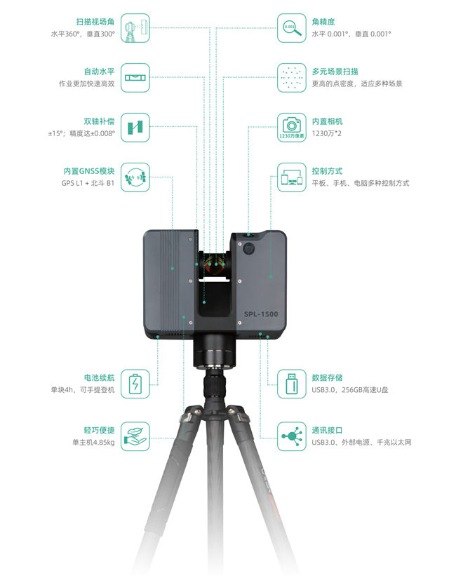 南方SPL系列配置1500m/620m/180m多种测程,覆盖全场景应用,毫米级精度精准构建三维场景;机身—体化高度集成设计,整机仅重4.85kg,便携易搬运;内置双1230万像素超清相机,快速采集场景全彩信息,色彩还原度拉满,实景细节分毫毕现;单站用时最短16秒,外业效率显著提升;集成双轴补偿、GNSS、电子罗盘、高度计、温度计等多类传感器,设备运行状态实时清晰捕捉,作业数据更精准。