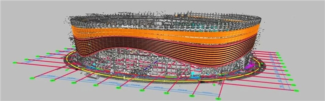 项目背景:某省级大型体育中心体育场为城市地标建筑,外立面采用大跨度、双曲面异形幕墙,骨架结构复杂、节点密集、空间形态极不规则。传统测量无法完整还原三维曲面形态,难以支撑铝单板逆向建模与定制设计,是项目施工的核心难点。